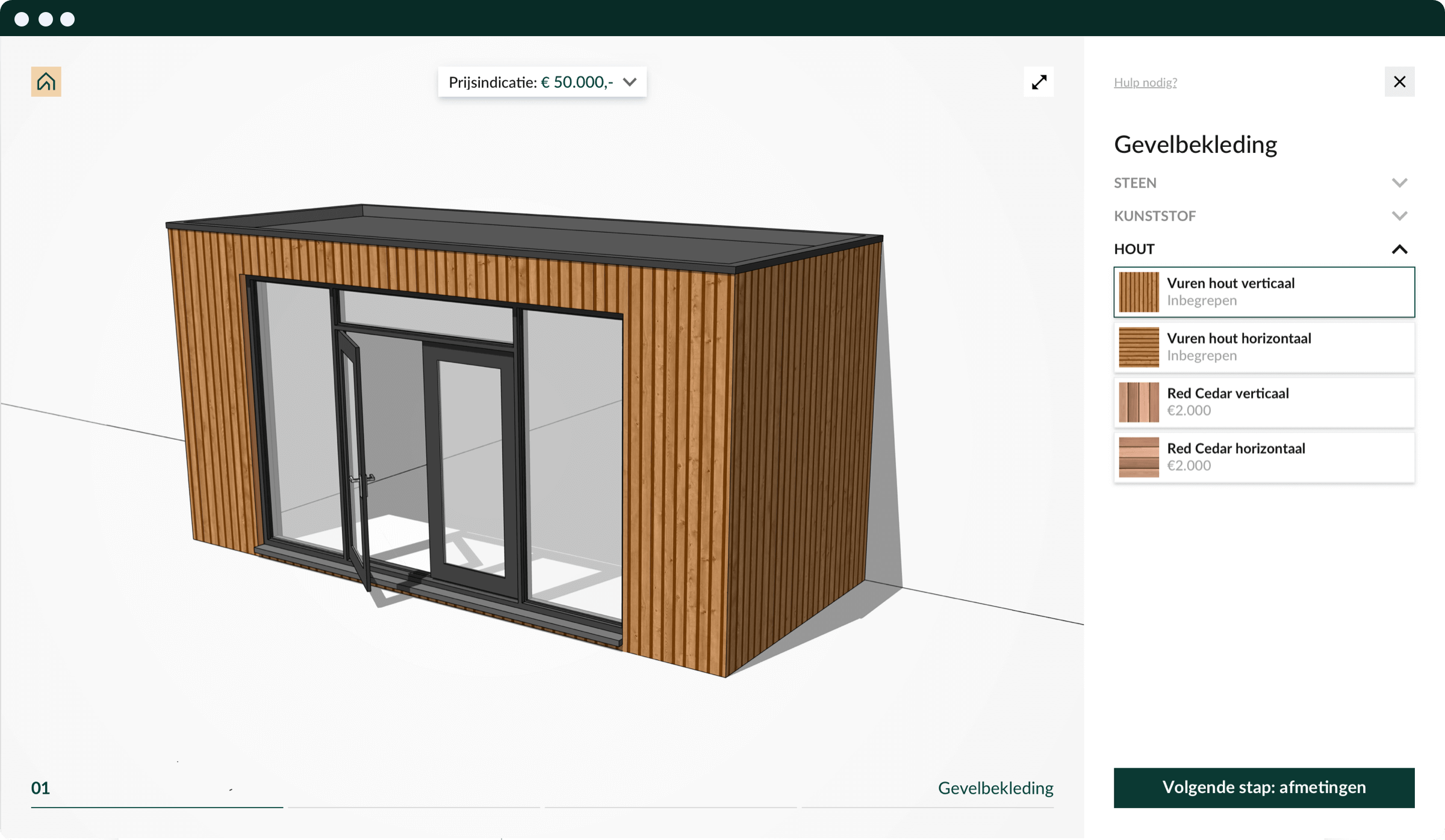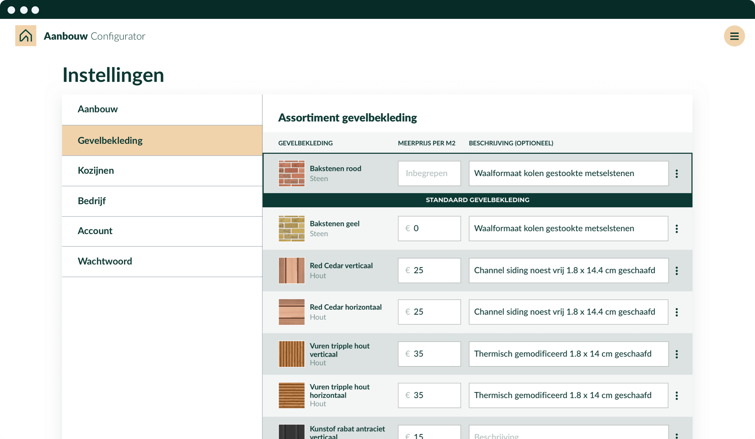 Kies uw assortiment van gevelbekleding en kozijnen en stel uw logo en huisstijl kleuren in